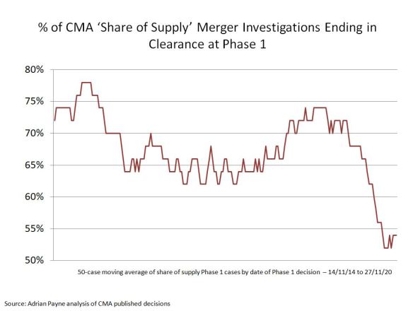 As the following diagram shows, since mid-2019 the proportion of ‘share of supply’ cases cleared at Phase 1 has nose-dived.