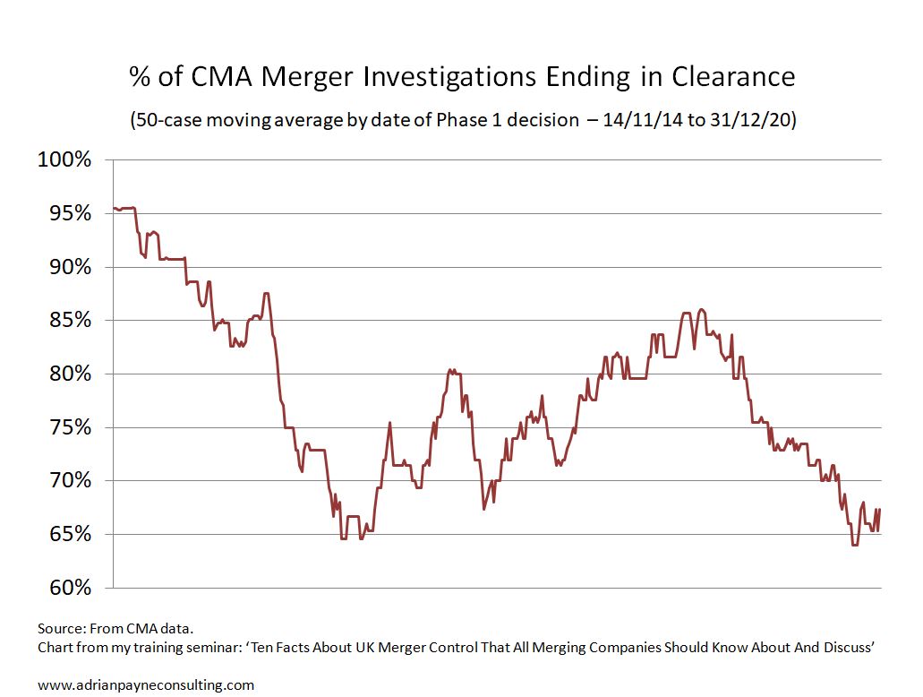 CMA Decisions – 2014 to 2020 Here is a summary of the pattern of CMA decisions during the first six years of the CMA. And here is a 50 case moving average showing how the percentage of cases that are unconditionally cleared has evolved over time. Share this: Click to share on X (Opens in new window) X Click to email a link to a friend (Opens in new window) Email Click to print (Opens in new window) Print Click to share on LinkedIn (Opens in new window) LinkedIn Like Loading...